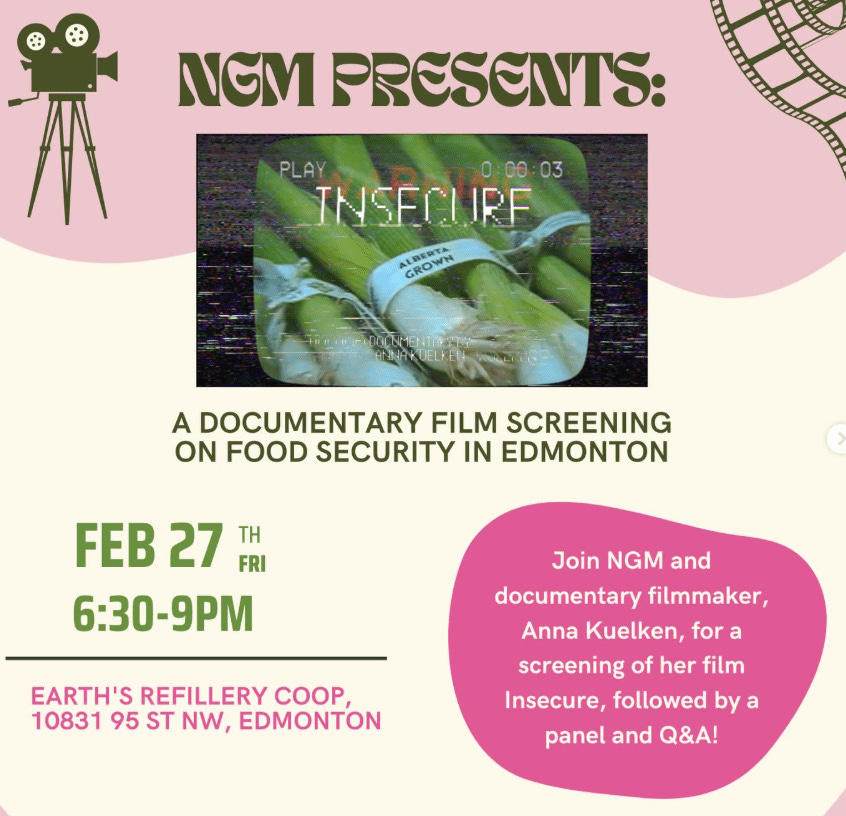 February 27th, Friday – Insecure, a documentary film screening on food security in Edmonton: “NGM is excited to host Anna Kuelken @cardhousedreamer , a documentary filmmaker on Treaty 6 Territory, for a screening of her film Insecure. Insecure explores the links between food insecurity and wider inequalities in Edmonton, AB. After the screening, we will be joined by some of the film’s featured guests for a panel discussion and Q&A. NGM is grateful to @earthsrefillery for sharing their space with us for this event.