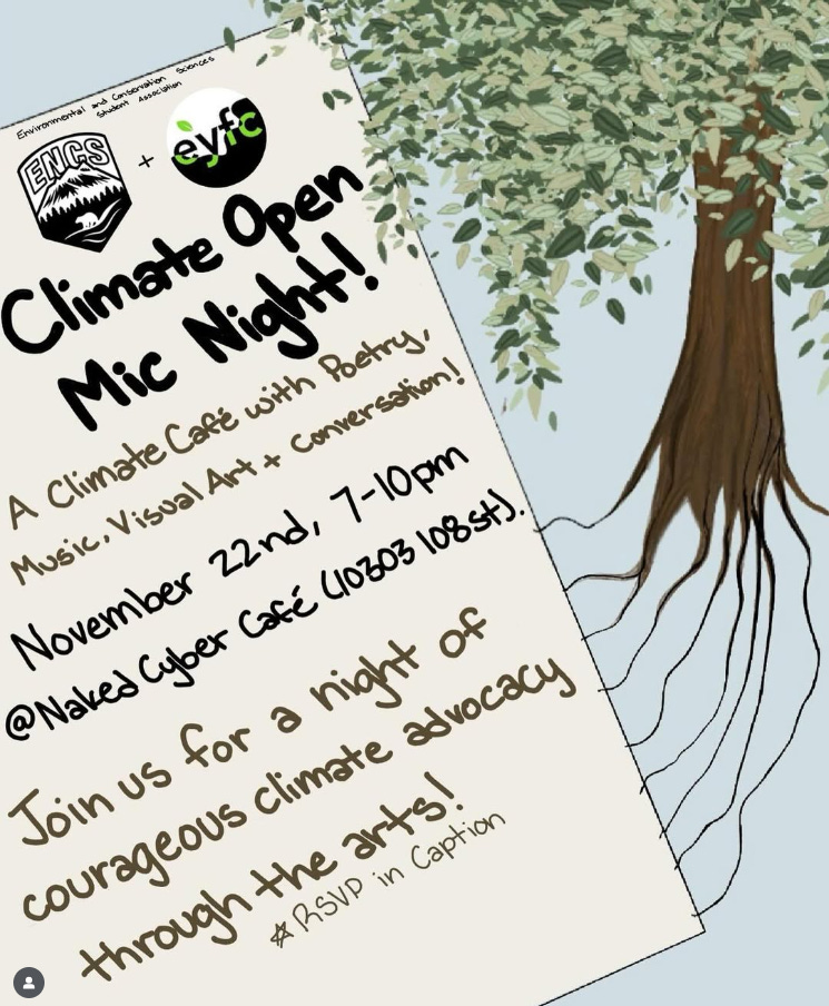 November 22nd, Saturday – Climate Open Mic Night: “Come to share space and build community in this collaborative event between Edmonton Youth for Climate and the Environmental and Conservation Student Association at the University of Alberta! Take in art pieces, register to share your own in any form, and enjoy good people with good conversation. Please note that we reserve the right to moderate content as deemed appropriate by the organizers.”