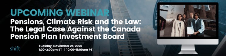 November 25th, Tuesday – Webinar: Pensions, Climate Risk and the Law: The Legal Case Against the Canada Pension Plan Investment Board: “Join us for a conversation with Ecojustice, Canada’s largest environmental law charity that’s taken on the case, and two of the young Canadians taking CPPIB to court. They’ll explore how this legal action could reshape pension fund responsibilities in the era of climate crisis – and share why they’ve taken up this fight for retirement security in a safe climate future.