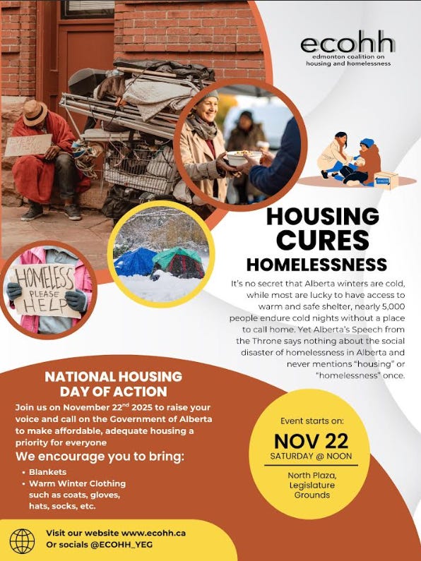 November 22nd, Saturday – National Housing Day: Normally a ceremony is held at the Homelessness Memorial just north of city hall but with the utter failure by the provincial government on housing things are being planned for something more.