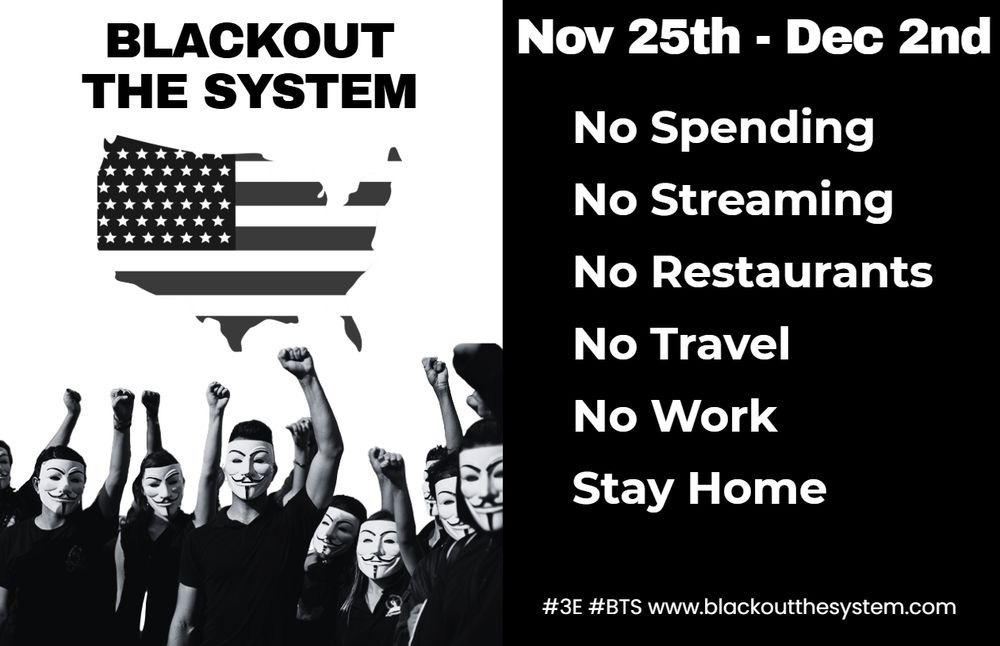 November 25th – December 2nd – Blackout the System: “It’s not Left vs. Right – It’s Up vs. Down – Their strength is our spending!