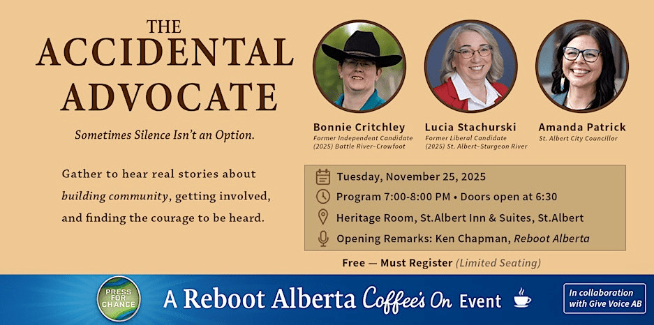 Reboot Alberta / Coffee’s On invites you to a free, inspiring evening focused on community action and civic courage, in partnership with Give Voice AB.