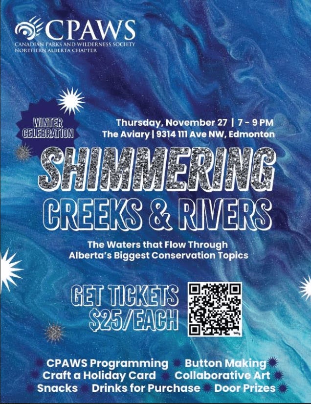 November 27th, Thursday – Shimmering Creeks and Rivers: “CPAWS Northern Alberta is proud to present our upcoming winter celebration: “Shimmering Creeks and Rivers: The Waters that flow Through Alberta’s Biggest Conservation Topics”. Not only is this a chance to gather as a community, but this is an important fundraising opportunity for our chapter to raise funds for conservation in Alberta and to connect with members.”