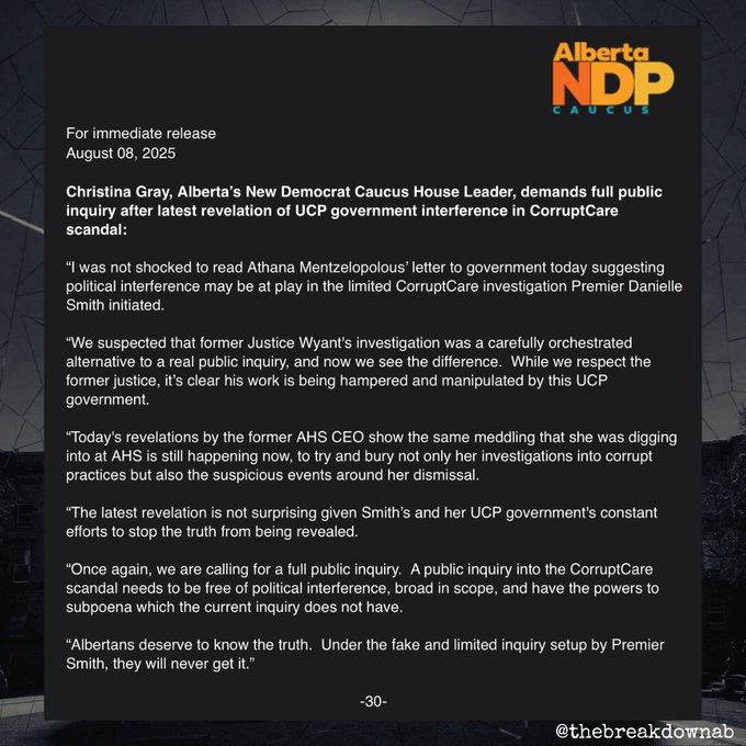 We will repost information on Athana’s case when there is an update. (I have been following James DiFiore and David Wallace as they pursue this case. James DiFiore recently reactivated his podcast channel “Blackballed.” They have taken the angle that this is a coup against the UCP government and that everything that has been reported is aimed at taking down the UCP government. The fact that Albertans want transparency and accountability for what is happening in Health Care is being questioned through this lens. Something doesn’t add up here, and I am not sure what it is. I just wanted to highlight this in case you have questions about this interest in Alberta politics from people who live in Eastern Canada, too.) On Friday there was a new development - check the Corrupt Care section for the information.
