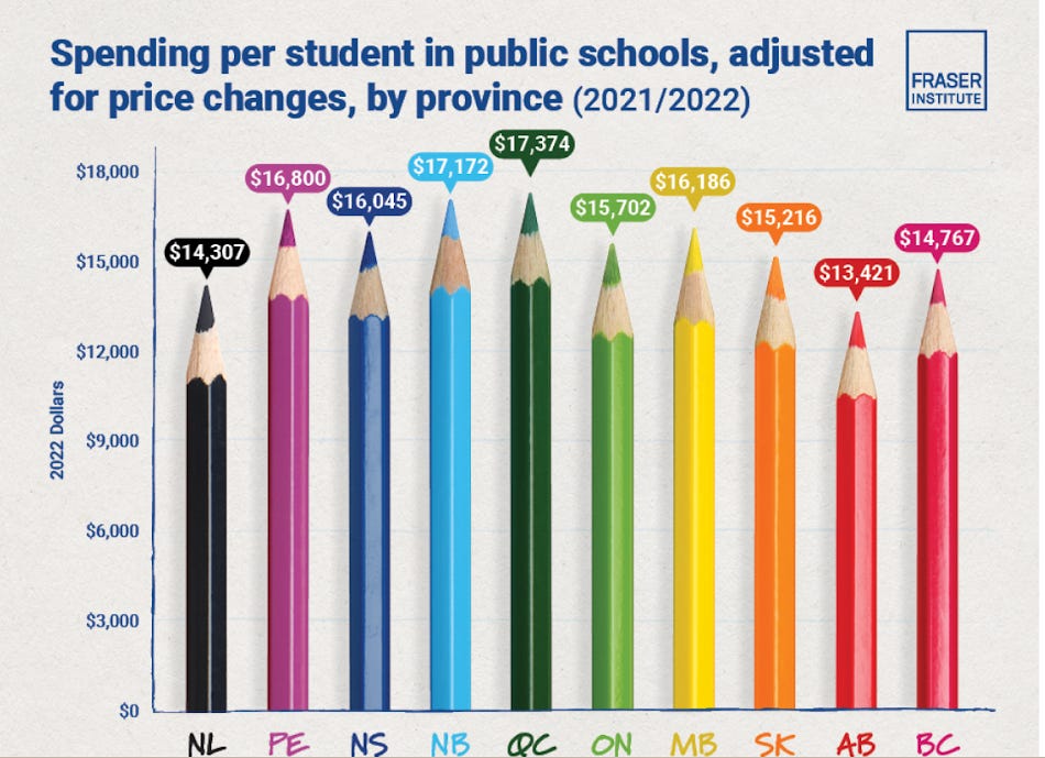 Alberta is the lowest k-12 funding of all Provincial schools based on the Fraser Institute and the ATA. Here are some tables comparing Alberta and Quebec (Yes Quebec gets equalization payments - but they invest money in education and healthcare)