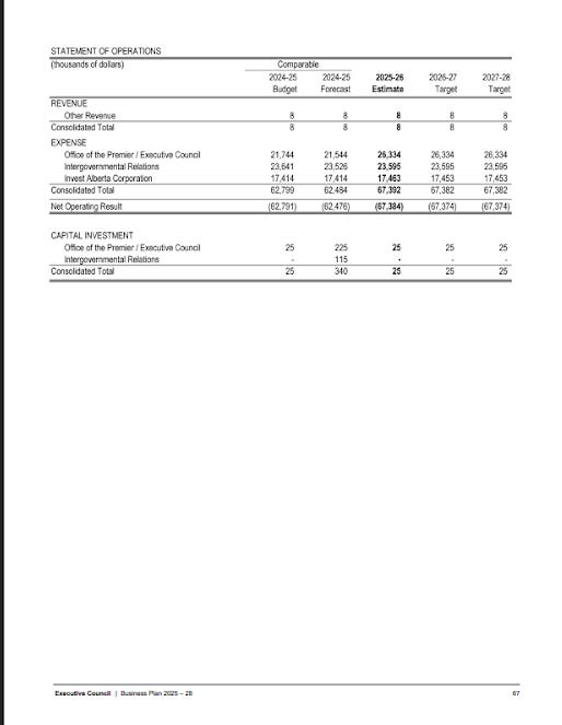 2025-28 Business Plan $62,476,000 budget for Executive Council which includes the Office of the Premier at $26,334,000, Intergovernmental Relations $23,595,000 and Invest Alberta Corporation at $17,463,000. How many Doctors, Nurses, Teachers and Support staff could we hire for Albertans with some of that money. In three years we have gone from $15 million to $62 million. Granted she has folded the Energy War Room into her office. She has taken the publicity department under her wing as well. She has even taken Invest Alberta under her direct control for $17 million/year which is almost as much as her whole office budgeted for in 2022.
