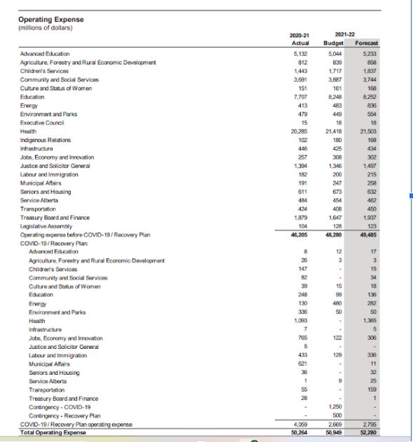 2022 - they spent $21.418 billion and we had a population of 4.5 million. The government spent $4759.56 per Albertan.